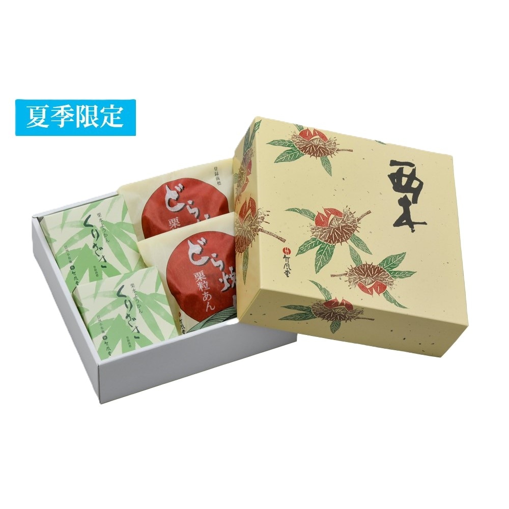 一番人気の「どら焼山 栗粒あん」と夏季限定の栗水ようかん「くりざさ」を詰め合わせた夏におすすめのセット。